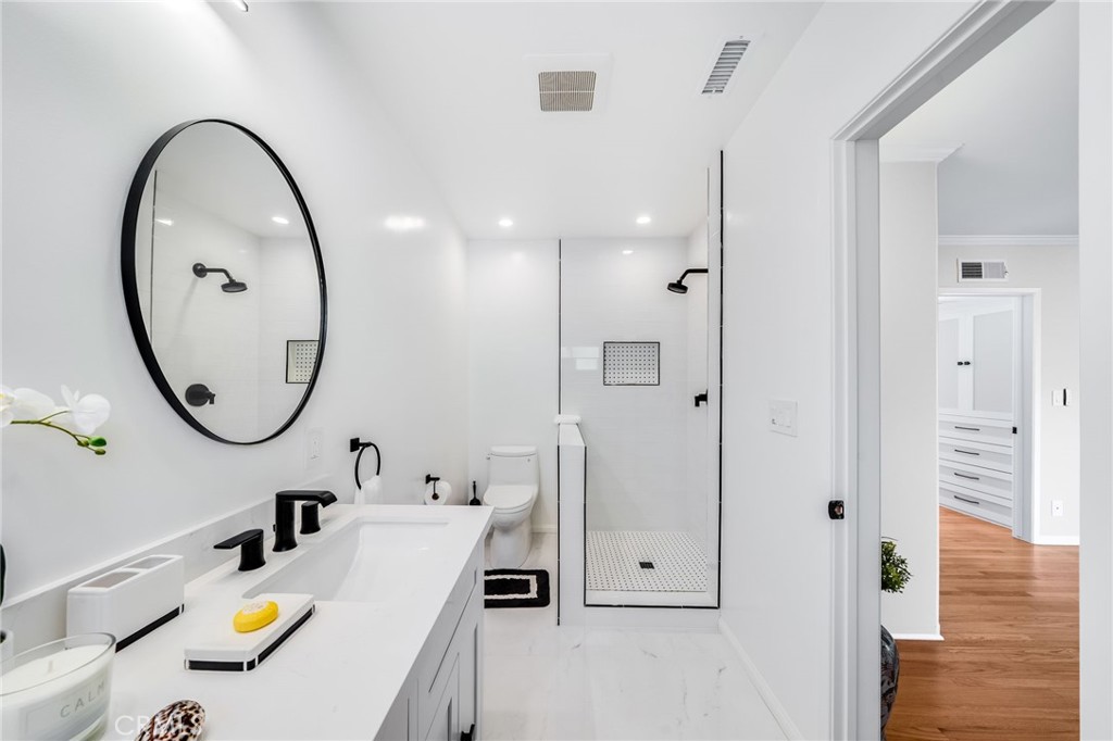 A classic mid-century rancher, the home has been reimagined and updated for modern living. The gorgeous kitchen, designed with a focus on functionality, is replete with top-shelf Wolf, Bosch, and Thermador appliances. The floor plan flows effortlessly from the ocean-view living room through the dining room to the expansive kitchen.