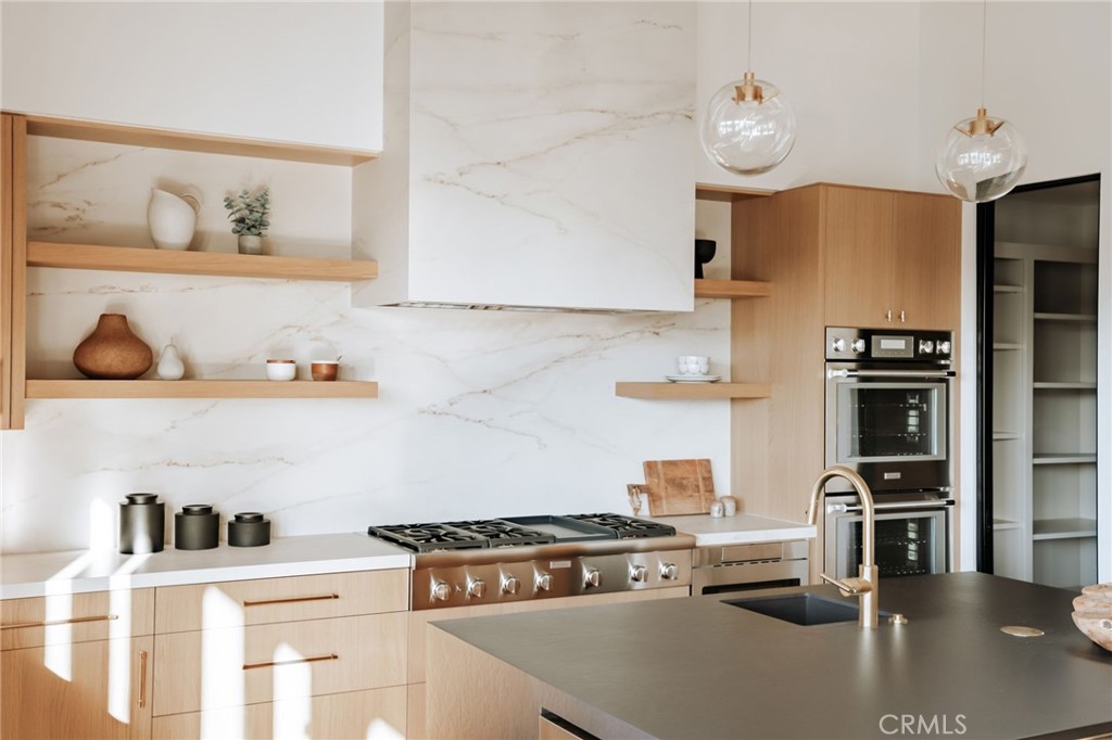 Rarely does a property that is created with such detail and care come to market immediately after completion. Welcome to 427 Santa Ana, your opportunity to own a curated luxury property without the wait! Thoughtfully designed by architect Karl Dakteris, this remarkable, newly constructed, custom modern masterpiece will check all of your boxes, from the 5 bedrooms each with en suite bathroom, the attached multi-level ADU, to the stunning double wide parcel with prime indoor/outdoor living. The grandeur of this home unfolds as you enter through the impressive entrance and find yourself swept into a world of high end modern luxury. Utilizing a mix of quality natural materials and expansive walls of glass to allow for natural light, this home is a stunning combination of contemporary design and warmth. Travel through the open-concept layout, anchored by a two-story limestone fireplace wall and a striking custom chandelier of European hand-blown glass, and discover exceptional attention to detail throughout. The heart of the home is the intelligently designed kitchen. With an extra-large central island, gorgeous and functional Dekton countertops, custom minimalist cabinetry, high end chef's appliances, a walk-in pantry, and an additional complete caterer's kitchen, this custom kitchen is the perfect backdrop for any gathering or culinary adventure. Retreat to the primary suite where you will find dual walk-in closets, a luxurious spa-like bath outfitted for ultimate relaxation, and an attached large deck.